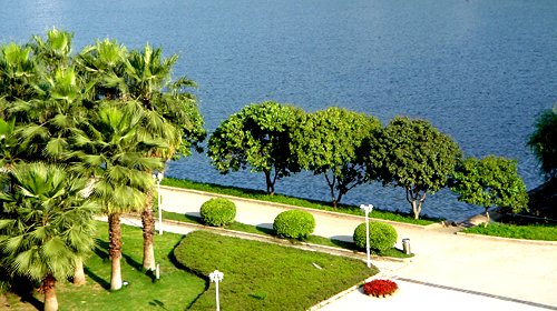 打开如下左图的图像,这是在一所大学拍摄的校园风景。使用色阶命令【图像>调整>色阶】〖CTRL L〗,看到色阶的设置框如下右图所示。可以看到它和前一课中的直方图非常类似。注意下面有黑色、灰色和白色3个小箭头(图中红色123处)。它们的位置对应“输入色阶”中的三个数值(图中绿色123处)。